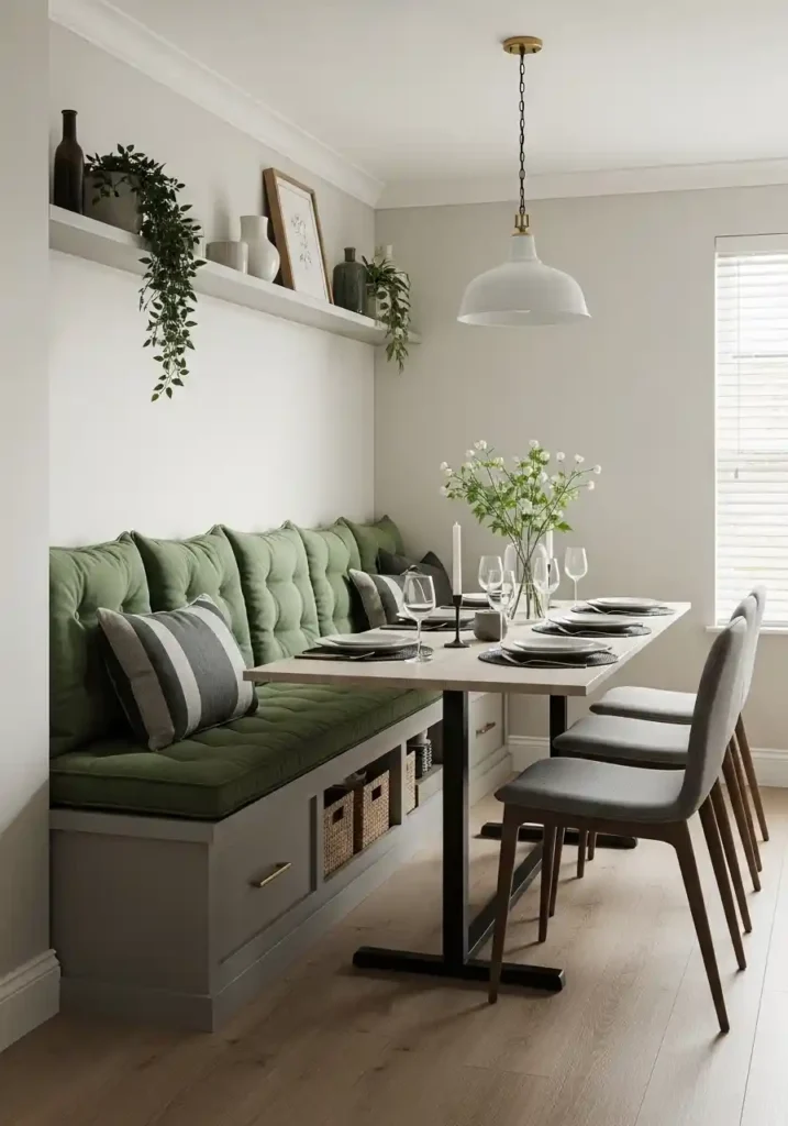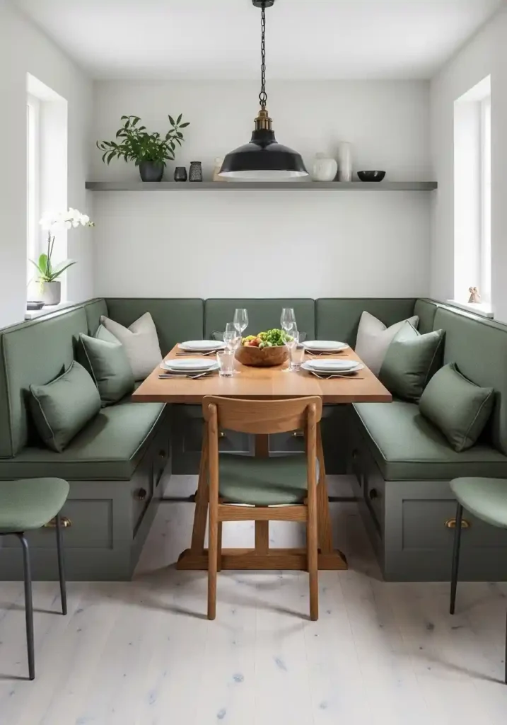 A built-in banquette dining nook is the small dining room’s most spatially efficient and most genuinely cozy dining solution — because the fixed bench seat on two walls requires absolutely zero chair-pullout clearance on the wall sides, making the banquette’s total dining footprint dramatically smaller than an equivalent number of freestanding chairs around a freestanding table would occupy in the same corner. A banquette that seats six people against two walls occupies a floor area that freestanding chairs for six could not approach, making it the most comprehensive seating solution per square meter available in any small dining room.