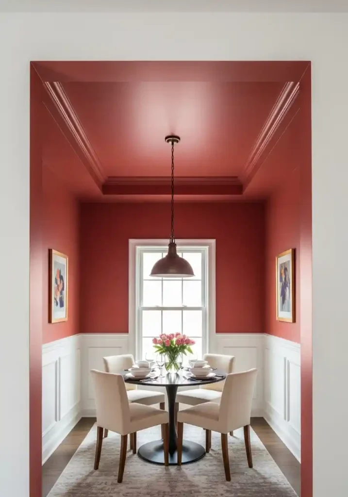 The color-drenching technique — extending the ceiling color slightly down the upper wall sections before transitioning to a contrasting lower wall color — creates the most complete and the most convincingly beautiful color-drenched ceiling effect available, because it prevents the ceiling color from appearing as a sharply defined ceiling panel and instead creates the impression of a warm color environment that envelops the upper portion of the room in a continuous, rich color experience of genuine atmospheric depth and genuine visual warmth. The color-drenched terracotta ceiling above white lower walls creates a small dining room of extraordinary intimacy and extraordinary, warm beauty.