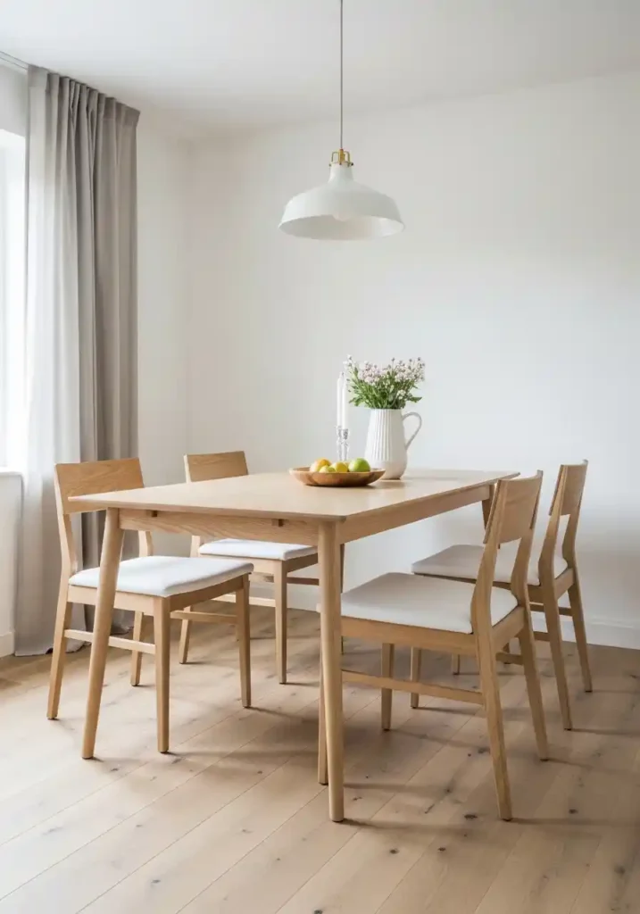 Consistently light-toned furniture in a small dining room creates the most complete and the most genuinely convincing visual space expansion available through furniture selection alone — because pale oak tables and chairs, when positioned in a room of white walls and pale flooring, create a furniture composition that appears to recede into the room’s light tonal environment rather than standing out as space-consuming objects. The eye perceives light furniture against a light background as occupying less visual space than equivalent dark furniture against the same background, creating a dining room that appears significantly more open and more spatially generous than a comparable dark-furniture arrangement in the same room.