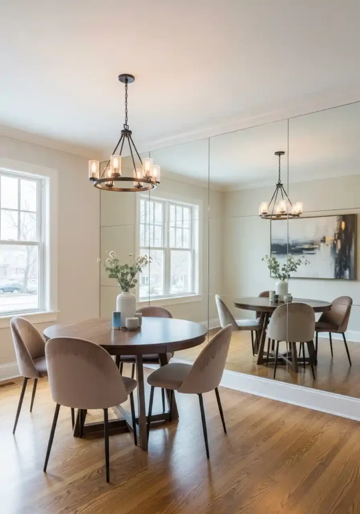 A floor-to-ceiling mirror spanning the full length of one dining room wall is the spatial transformation that most powerfully and most completely creates the impression of a dining room twice its actual size — because a full-height wall mirror reflects the entire dining room composition back into the space with such convincing spatial depth and such complete visual clarity that the room appears to extend equally far in both directions from the viewer, creating the impression of a generously proportioned dining room rather than a compact one. The reflection of the chandelier, the window, and the dressed dining table creates a doubled visual richness of extraordinary beauty.