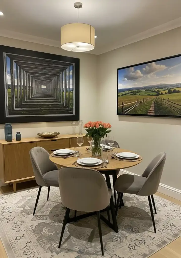 Strategic artwork placement in a small dining room is the design tool that most cleverly and most effectively uses visual perception to create the impression of greater spatial depth and greater room scale without any physical change to the room’s dimensions — because the human visual system responds to depicted space in artwork with the same spatial processing that it applies to actual physical space, and a large painting depicting a deep, receding landscape effectively extends the dining room’s visual field far beyond its actual walls by providing the eye with a compelling, beautifully depicted spatial depth to inhabit. The right artwork makes a small dining room feel significantly less enclosed.