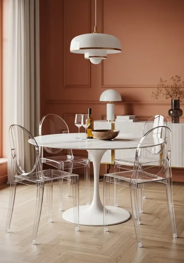 The specific visual mechanism that makes ghost chairs so powerfully space-expanding in a small dining room is their complete transparency to the floor surface beneath them — because the flooring visible through the clear acrylic of each chair extends the dining room’s floor plane continuously and uninterruptedly through the chair positions rather than stopping at the chair legs as it would with opaque alternatives. The eye reads the continuous floor plane as open, unoccupied space rather than as chair-occupied territory, creating a perceived floor area of genuine generosity that makes the small dining room feel significantly larger than its actual square footage. Ghost chairs are the small dining room’s best optical illusion.