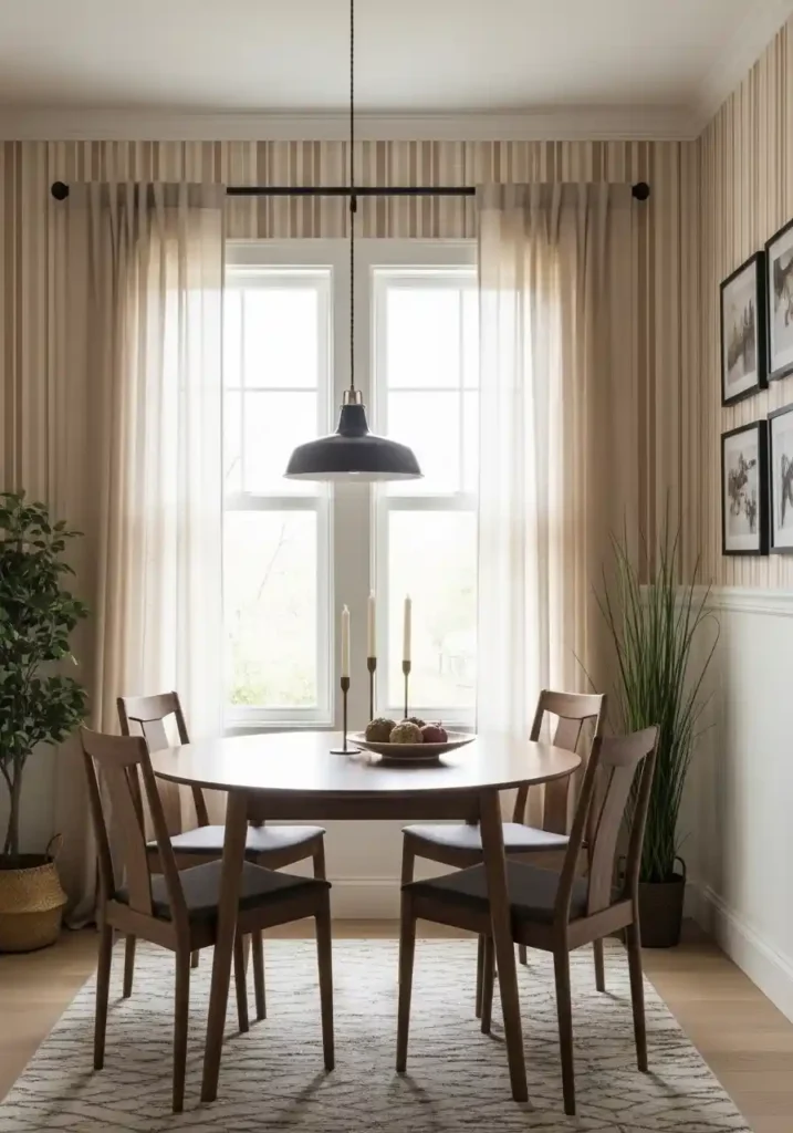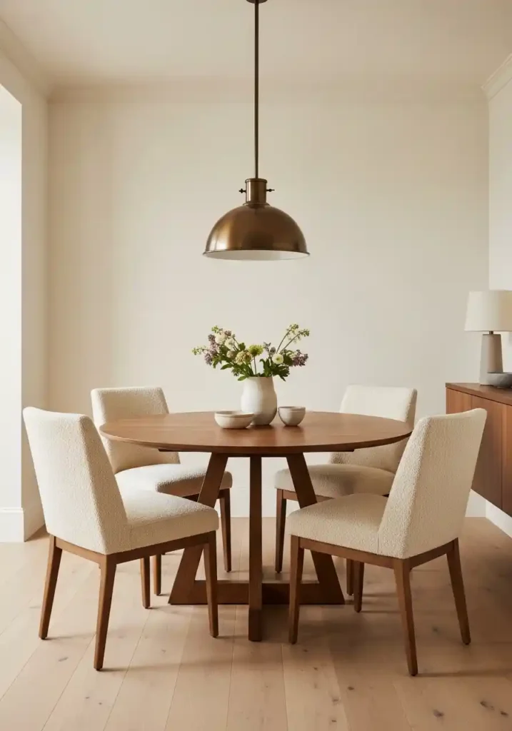 A round dining table is the single most effective space-maximizing furniture choice available for a Small Dining Room Ideas — because the round form eliminates the corners that rectangular tables create, allowing people to move around the table more naturally and more easily in the limited floor space of a compact dining area, while the absence of a table end means that the clearance between the table edge and the walls is more consistently maintained from every angle. A round table for four occupies the same floor area as a rectangular table of equivalent seating capacity but feels dramatically less spatially dominant.
