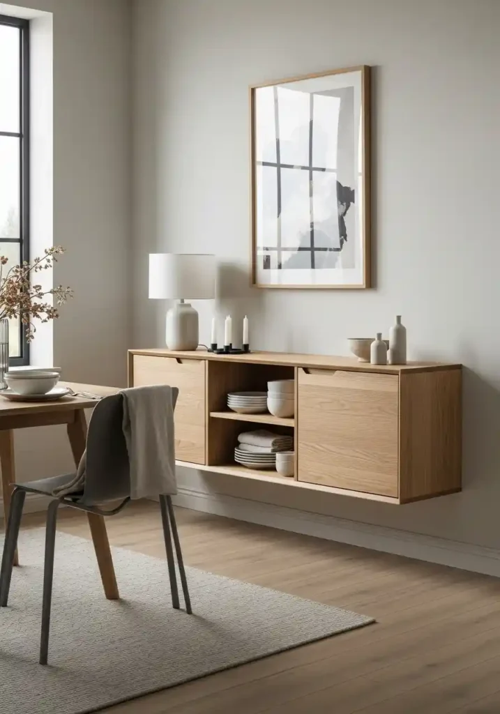 A wall-mounted floating sideboard in a small dining room is the storage solution that delivers the most complete and the most permanently effective combination of generous dining room storage and maximum visual floor space — because a floating sideboard with no legs beneath it allows the eye to read the floor area beneath the cabinet as open, unoccupied floor rather than as storage furniture footprint, creating the consistent visual impression of more floor space than the room actually possesses. The floating sideboard provides the same storage capacity as a legged equivalent while consuming dramatically less perceived floor space in the compact dining room.