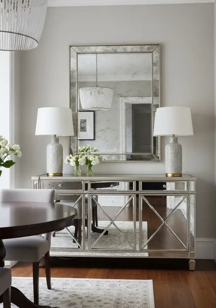 The mirrored sideboard’s specific contribution to the small dining room’s lighting quality is as significant as its contribution to the perceived spatial depth — because a mirrored surface positioned opposite the room’s primary window reflects natural daylight into the dining room from a direction opposite to the window, creating the impression of a second window and dramatically improving the natural light quality of the small dining room’s darkest corners. In a compact dining room where natural light is always at a premium, the mirrored sideboard’s ability to redirect and amplify the available daylight makes it simultaneously the most practically storage-generous and the most atmospherically light-enhancing furniture piece available.