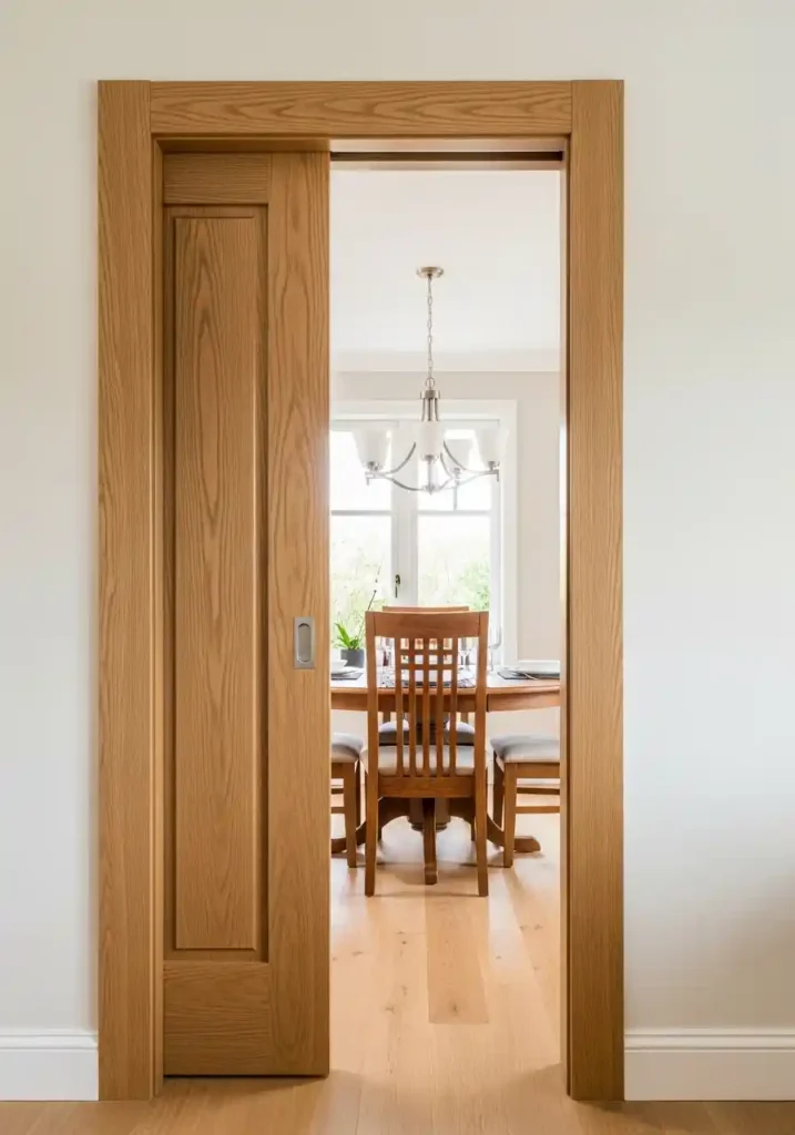A pocket door that slides into the wall cavity rather than swinging into the dining room or the adjacent space is the architectural intervention that most immediately and most permanently improves the small dining room’s floor space at its most critical and most circulation-sensitive location — the entry threshold. A conventional hinged dining room door requires a clear swing arc of approximately one square meter of floor area on at least one side of the doorway, and in a small dining room where one square meter represents a genuinely significant proportion of the total available floor space, eliminating the door swing arc entirely returns that floor area to the dining room’s permanent, usable territory.