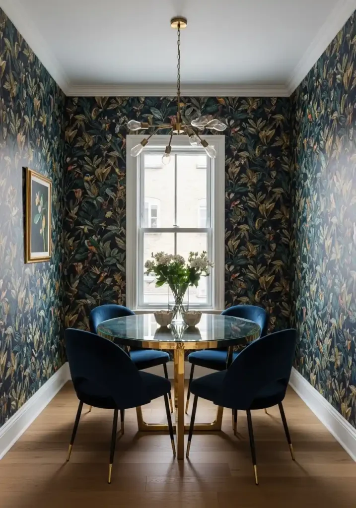 The four-wall wallpaper installation — covering every wall of the small dining room with the same bold botanical pattern rather than using wallpaper on a single feature wall — creates the most complete and the most genuinely extraordinary small dining room transformation available, because it creates a quality of total, three-dimensional immersion in the wallpaper’s pattern and color that a single feature wall can never approach. Every diner in the small dining room is surrounded on all sides by the botanical world of the wallpaper, creating a dining experience of such extraordinary, complete sensory immersion that the room’s small size becomes not a limitation but the precise quality that makes the immersive wallpaper experience as intense and as magnificent as possible.