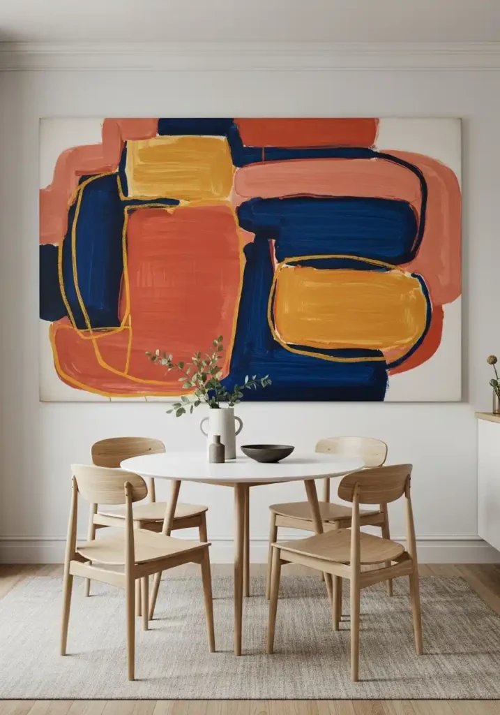 The size relationship between the artwork and the wall it occupies in a small dining room is critically important — and the most common mistake is choosing a piece that is too small, which floats awkwardly above the table without creating the strong focal point that the room needs. In a small dining room, choose artwork that spans at least two-thirds of the wall width above the table, so that the piece reads as genuinely architecturally scaled rather than merely decorative. Abstract works in bold, warm colors — terracotta, deep blue, warm gold, forest green — create the most atmospherically impactful results in dining room contexts. Hang the artwork so its center sits approximately sixty inches from the floor, and step back to verify that it reads as confidently as the room deserves.