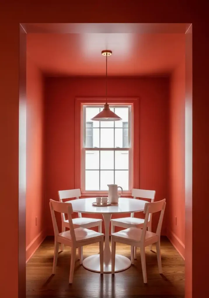 The colors that work most magnificently for color-drenched small dining rooms are the deep, saturated, warm tones that create maximum jewel-box effect — terracotta, deep burgundy, forest green, midnight navy, and rich plum all look extraordinary when wrapped continuously from wall to ceiling. The white furniture, the brass fixtures, and the natural wood tones that inhabit the room provide all the contrast and visual relief that the color-drenched envelope needs to avoid feeling overwhelming. In a small dining room, color drenching transforms a spatial constraint — the room’s limited size — into an aesthetic advantage, creating an intimacy and atmospheric richness that a larger room with separated wall and ceiling colors could never quite replicate.