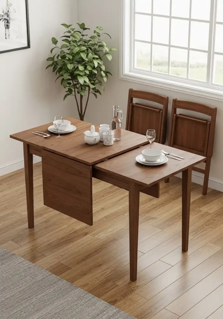 When guests arrive and the extension leaf is deployed, the same table transforms in under thirty seconds into a generous dining surface that seats six, eight, or even more — depending on the specific table design — turning the small dining room into a proper entertaining space that makes guests feel genuinely, warmly welcomed rather than squeezed in as an afterthought. The butterfly leaf mechanism, which stores the additional table section within the table base and deploys without removing any separate stored piece, is the most elegant and most space-efficient extension system available. Choose a table in a beautiful solid wood or high-quality veneer that is as lovely in its compact everyday form as it is at full extension for a dinner party.