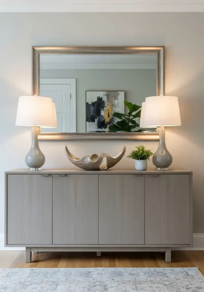 The styling of your sideboard top in a small dining room is the decorating exercise that delivers the most beautiful results relative to the effort and cost invested — because a sideboard top, positioned at a height and scale that makes it naturally prominent in a small room, is the perfect scale for a composed, balanced, beautifully considered vignette. A large mirror above the sideboard doubles the apparent width of the room and amplifies the light from your pendant and candles beautifully. Two matching table lamps on either side of the mirror create warm, symmetrical lighting that flanks the sideboard with elegance. A single sculptural object at the center, a small plant at one end, and a stack of beautiful dining room books at the other complete a composition of relaxed, confident style.