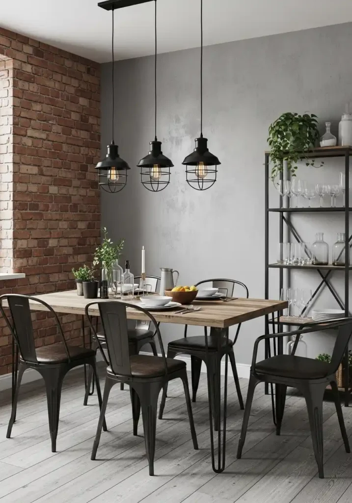 The industrial small dining room works most beautifully when the contrast between its raw material elements and a few carefully chosen refined accents is managed with genuine intentionality. A reclaimed wood table with visible grain, knots, and age marks on black hairpin legs is the perfect central piece — warm, organic, and characterful against the harder, cooler industrial elements surrounding it. Black metal chairs with leather seat pads add comfort and a slight softness to what could otherwise become a too-hard aesthetic. Plants on open metal shelves bring the organic world’s warmth and color to the room’s cool, industrial palette. A single industrial cage pendant in matte black provides the perfect overhead accent that ties the whole beautifully edgy composition together.