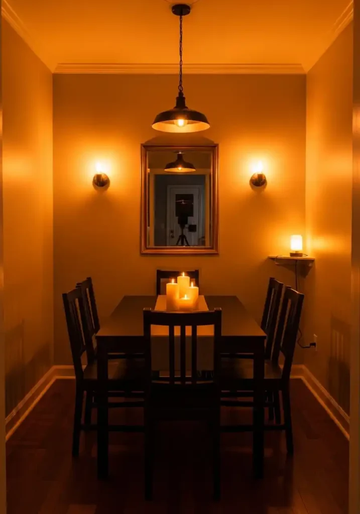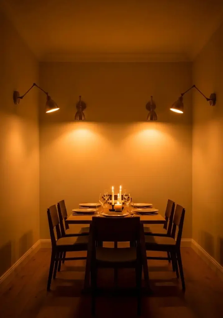 Building a layered lighting scheme for a small dining room is straightforward and enormously rewarding: start with a beautiful pendant above the table as your primary, mood-setting source. Add wall sconces on one or two walls — flanking a mirror, on either side of a piece of art, or simply positioned where they cast the most beautiful warm light across the room — to create flattering directional side lighting that eliminates the harsh shadows a single overhead source creates. Add candles to the table itself — tall tapers in candlesticks, a cluster of pillar candles, or tea lights in glass votives — for the living, flickering warmth that no electric source can replicate. These three layers together create a dining room that glows.