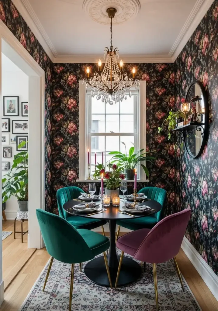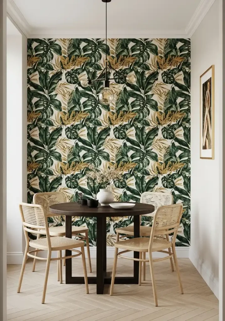 The wallpaper choices that create the most beautiful and most photographically stunning results in small dining rooms are those that are genuinely bold in scale, color, and pattern — designs that would feel timid or underwhelming in a larger room but that fill a small dining room with personality and visual richness in exactly the right proportion. Oversized botanical prints with dramatic leaves in deep greens and warm golds. Maximalist vintage floral designs in jewel tones against a dark background. Bold geometric Art Deco patterns in deep navy and brass. Painterly abstract designs in colors that pick up your dining chairs or your pendant light. Choose one wall — ideally the one you look at most directly while seated at the table — and let it be absolutely magnificent.