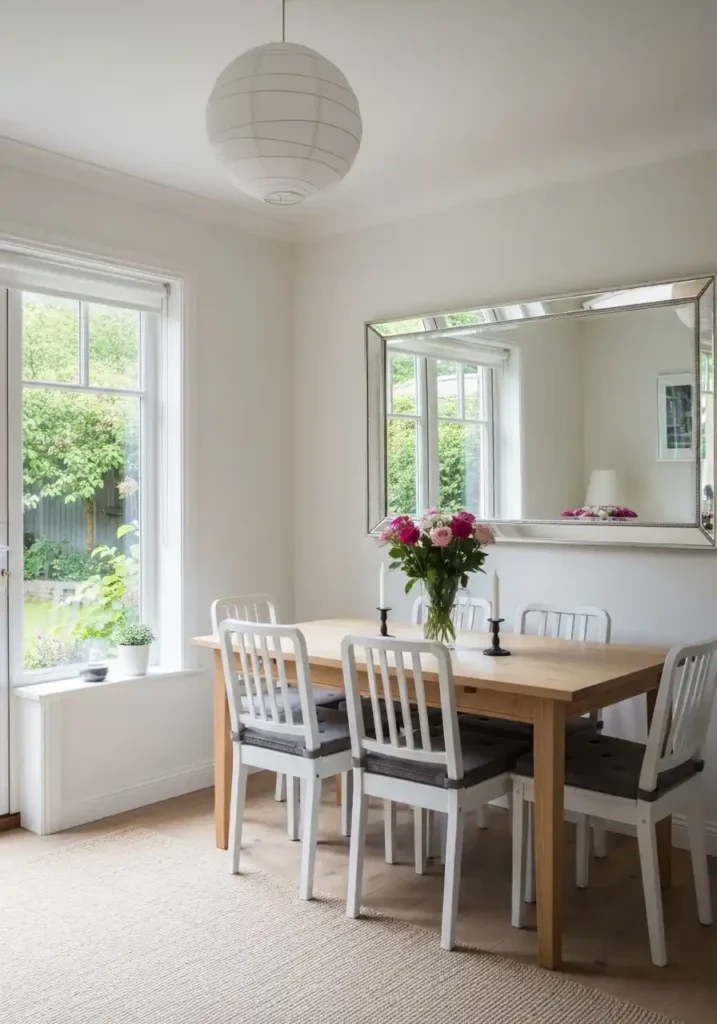 The most effective mirror for maximizing natural light in a small dining room is one positioned directly opposite the room’s primary window, large enough to reflect the entire window opening including the sky and garden or street view beyond it. The reflected image creates the extraordinary illusion of a second window on the opposite wall — doubling the perceived sources of natural light and making the room feel simultaneously brighter, more open, and more connected to the outdoors. This reflected view also adds visual depth to the small room that is genuinely difficult to achieve by other means — suddenly the dining room seems to open onto a garden or a sky that isn’t actually there, and the spatial effect is both beautiful and thoroughly convincing.
