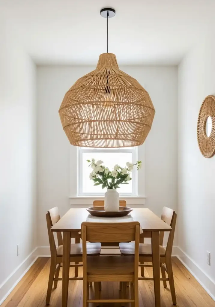 The magic of an oversized pendant in a small dining room is the way it reframes the room’s scale — making the smallness of the space feel intentional and intimate rather than limiting and unfortunate. A large woven rattan pendant that seems almost too big for the room creates a sense of dramatic enclosure that makes the dining table beneath it feel like a private stage set for the most beautifully lit performance of every meal. A sculptural blown-glass pendant in deep amber or cobalt transforms the ceiling into a piece of gallery art. A cluster of small pendants at varying heights creates a composition of extraordinary visual complexity that draws every eye upward and fills the room with warm, layered light from multiple angles simultaneously.