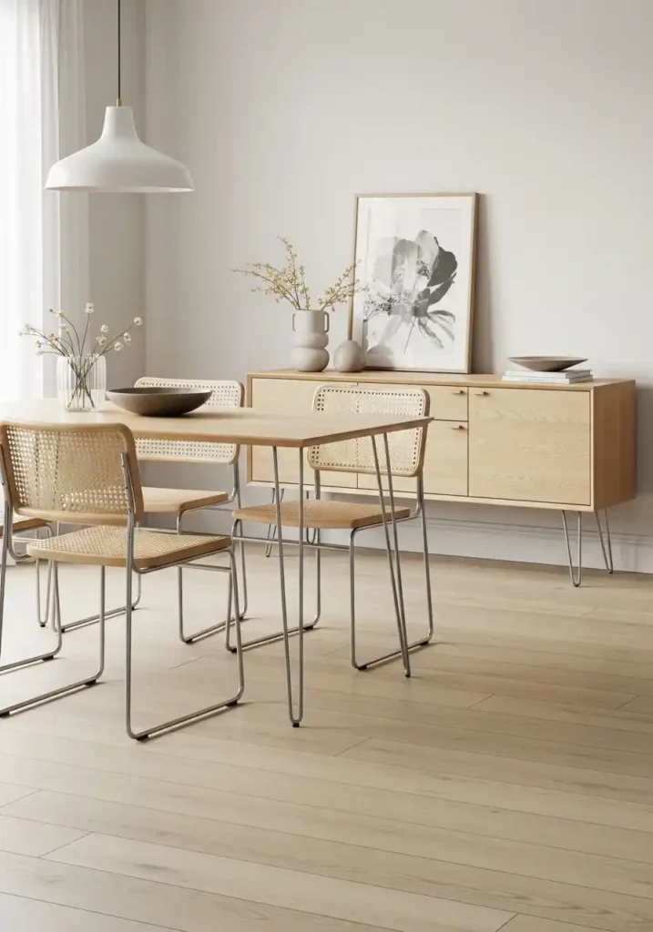The specific furniture design language that delivers the most visual lightness in a small dining room is mid-century modern at its most refined — hairpin legs on tables and consoles, cane backs on chairs that create visual transparency rather than solid planes, slim tapered wooden legs in natural oak or walnut that elevate every piece off the floor with graphic elegance. A hairpin-leg dining table in light oak with a thin tabletop has almost no visual weight whatsoever — the room appears to flow beneath and around it as though the table is barely there. Four matching cane-back chairs around this table create a dining arrangement of extraordinary visual lightness that makes a small room feel genuinely airy and spacious in a way that heavier furniture never could.