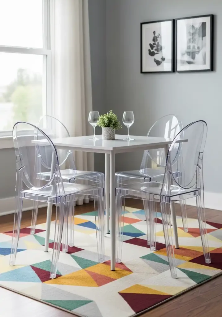 The beauty of ghost chairs in a small dining room extends well beyond their spatial illusionist credentials into genuinely interesting aesthetic territory — they are not invisible, they are translucent, and that translucency creates a fascinating visual quality that changes depending on the light conditions and the colored surfaces visible through them. A vibrant geometric rug seen through the ghost chairs takes on a slightly prismatic quality. The warm wood of the dining table floor reflects through the chair seats in a way that creates a subtle visual depth. Ghost chairs also have the democratic visual quality of working in virtually every possible small dining room aesthetic — they are as comfortable in a maximalist room filled with pattern and color as they are in a minimal white space, because they simply reflect and refract whatever surrounds them.