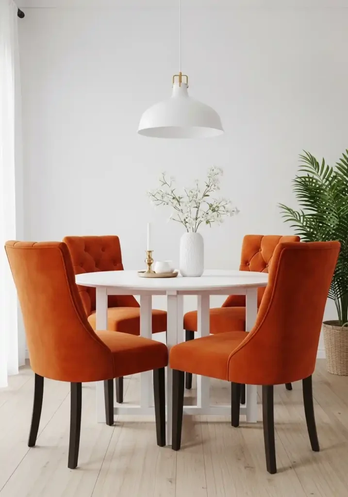 The color of your upholstered dining chairs in a small room is the most significant color decision you will make in that space — because four chairs positioned around a dining table occupy a substantial portion of the room’s total visual field and their color will essentially define the room’s dominant tone. Choosing a bold, rich, unexpected color — burnt orange velvet, deep teal boucle, forest green leather, rich burgundy linen — gives the chairs a design presence that makes the small dining room feel deliberately, confidently decorated in a way that neutral chairs never achieve. Keep everything else in the room simple and allow the chairs to be the undisputed, gloriously colored stars of the entire space.