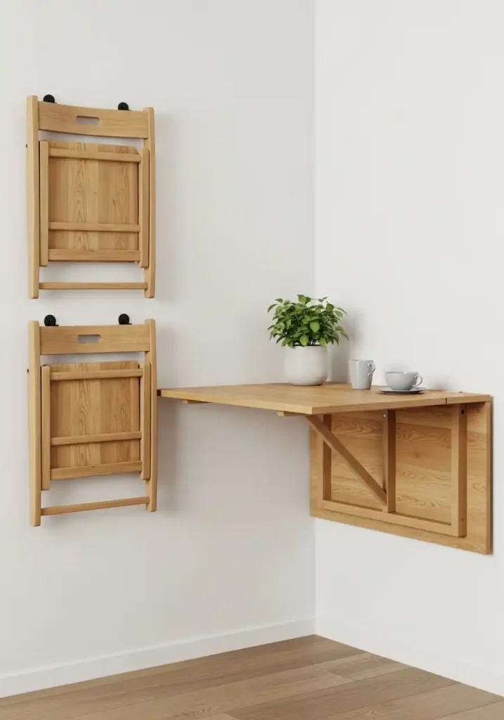 The design quality of a wall-mounted drop-leaf table matters enormously in a small dining space where it is never truly out of sight — even folded closed, it is always a visible element of the room, always contributing to or detracting from the space’s overall aesthetic. Choose a table in solid oak, walnut, or painted wood with proper brass or black steel hardware, so that the folded position reads as a deliberate, beautiful wall feature rather than stored equipment. A small plant, a candle, and a framed print positioned above the folded table transforms the wall into a styled vignette that looks intentional and lovely on ordinary evenings when no one is dining.