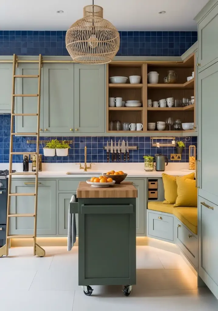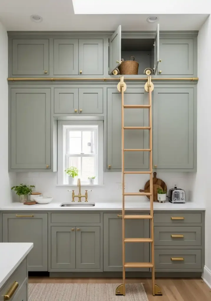 The rolling library ladder on a brass ceiling-mounted track is the practical and aesthetic device that transforms ceiling-height small kitchen cabinets from a beautiful but partially inaccessible storage installation into a completely functional, completely delightful kitchen feature of genuine character and extraordinary charm. The library ladder solves the height-access problem with such warmth, such elegance, and such complete reference to the beautiful private libraries of genuinely well-appointed homes that it makes the small kitchen feel not constrained by its compact dimensions but enriched by the brilliant organizational intelligence that those dimensions have inspired. The ladder is the detail that makes the small kitchen’s most practical decision its most beautiful one.