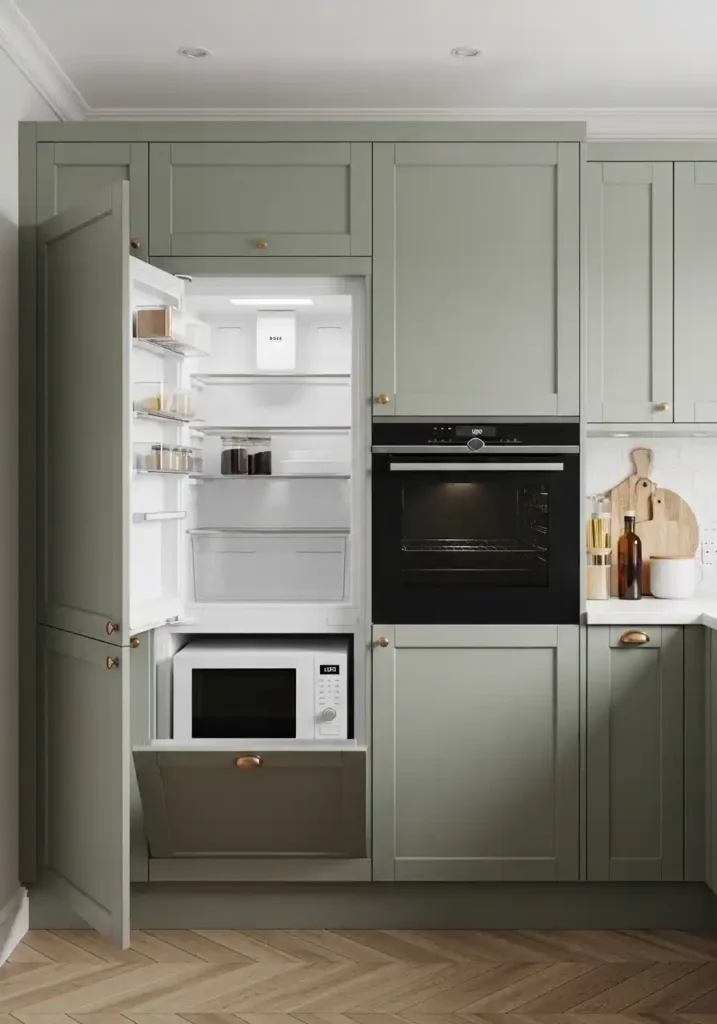 Fully integrated appliances in a small kitchen are not merely a design preference but the most practically transformative space maximization available — because in a small kitchen that is permanently, visually open to the daily life of the home, the large, visually dominant appliances that a kitchen must accommodate — the refrigerator, the dishwasher, the oven, the microwave — are among the most spatially aggressive and most visually disruptive elements in any compact cooking space, and concealing every one of them behind matching cabinet panels creates a visual calm and a spatial clarity of such complete, immediate, dramatic impact that the same small kitchen appears genuinely, significantly larger simply through the removal of these appliances from the room’s visual field.