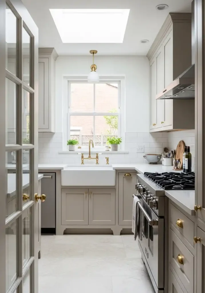 The corridor width between the two parallel galley runs is the kitchen’s single most critical dimensional decision — because a corridor that is too narrow makes movement through the kitchen uncomfortable and makes simultaneous two-person cooking physically impossible, while a corridor that is generously proportioned at 110 centimeters creates a galley of such comfortable, spacious working ease that the kitchen’s compactness becomes a genuine organizational virtue rather than a spatial compromise. A window or glass door at the far end of the galley corridor is the natural light provision that transforms the galley from a potentially tunnel-like space into a bright, naturally illuminated kitchen of genuine spatial quality and genuine daily pleasure.