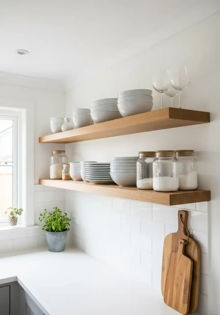 Replacing closed upper cabinets with open floating shelves in a small kitchen is the single renovation decision that delivers the most immediate and the most completely convincing improvement in the kitchen’s perceived spaciousness — because closed upper cabinet doors create a solid wall of visual mass that the eye reads as a heavy, space-consuming barrier, while open shelves allow the wall behind them to be seen around and between every displayed object, maintaining the kitchen’s sense of visual openness and spatial breathing room that no closed cabinet door, however beautifully finished, can replicate. The small kitchen with open shelves always feels more generous and more open.