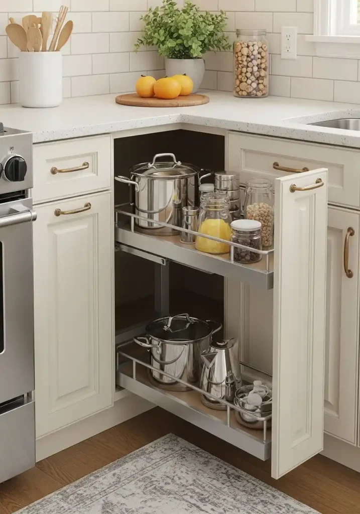 Smart corner solutions in a small kitchen are the storage interventions that most dramatically change the ratio between the kitchen’s apparent storage capacity and its actual usable storage capacity — because the conventional corner cabinet, with its deep, angular interior inaccessible to human arms of normal length, represents a genuinely significant volume of wasted space in every small kitchen that contains one, and an engineered corner solution that makes every inch of that volume genuinely, easily, and immediately accessible effectively adds a meaningful quantity of real storage to the small kitchen without adding a single new cabinet or a single additional inch of floor area.