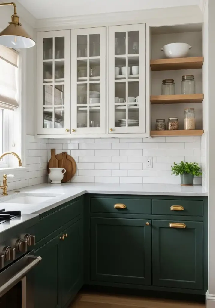 The specific color pairing that consistently creates the most beautiful and the most spatially successful two-tone small kitchen is a deep, saturated lower cabinet color combined with a clean, warm upper cabinet tone — forest green with warm white, deep navy with soft cream, charcoal with pale sage, or rich burgundy with ivory. The contrast between the tones creates a visual horizon line at counter level that the eye reads as a zone transition, making each zone feel more purposeful and more spatially defined. Brass hardware on both tones ties the two halves together with a warm metallic thread that makes the entire composition feel unified, considered, and completely beautiful.