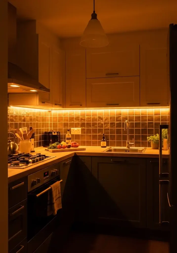 The color temperature of the LED strips is the technical specification that most determines the quality of the under-cabinet lighting’s atmospheric contribution — and warm white LEDs at 2700 Kelvin create the most beautiful, most flattering, and most genuinely atmospheric kitchen lighting effect available, casting a warm amber glow across the counter and backsplash that makes food look more beautiful, makes the kitchen feel more welcoming and more intimate, and creates a quality of warm, directed light that transforms the small kitchen’s evening character completely. The 2700 Kelvin warm white creates light that feels like candlelight rather than fluorescent illumination — the specific atmospheric quality that makes a small kitchen genuinely beautiful after dark.