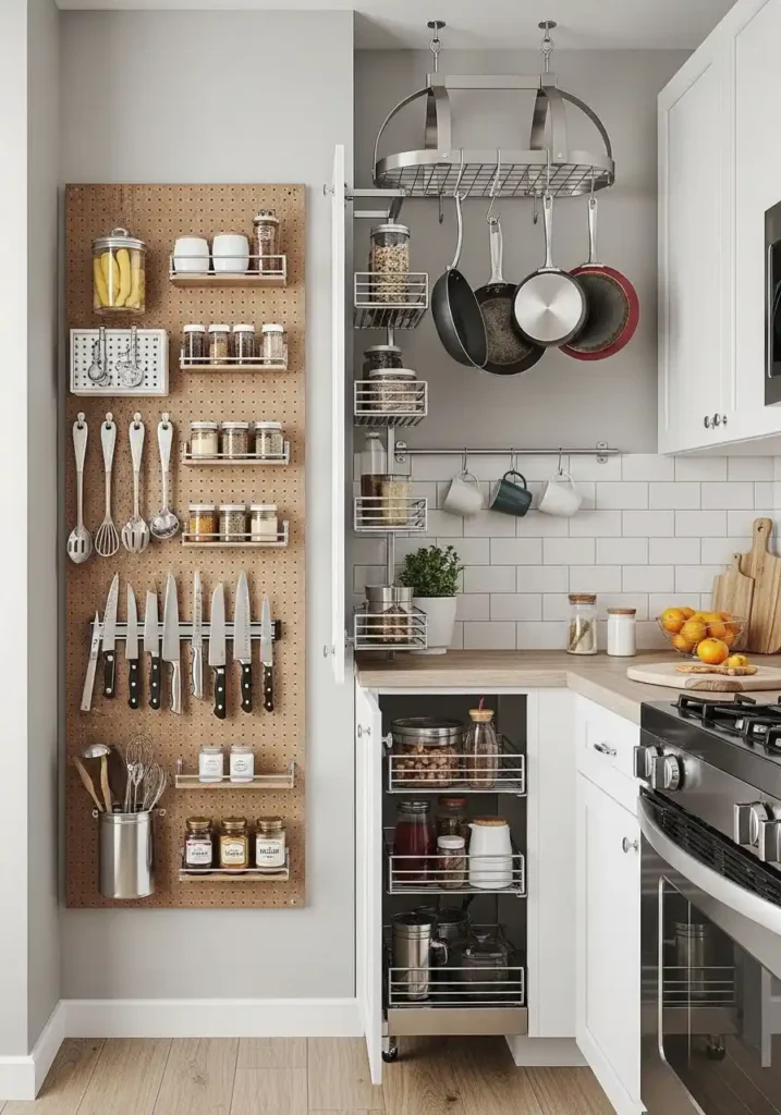 The pegboard panel is the vertical storage solution with the greatest flexibility, the greatest organizational intelligence, and the greatest daily adaptability available for a small kitchen wall — because its modular hook and shelf system can be infinitely reconfigured as the kitchen’s storage needs evolve over time, accommodating every size and every category of kitchen tool with equal ease and equal organizational clarity. A pegboard styled with genuine care — utensils grouped by function, spice jars aligned by label, hooks arranged by the size of what they hold — creates a kitchen wall of such genuine organizational beauty that it functions simultaneously as the small kitchen’s most practical storage surface and its most visually characterful design feature.