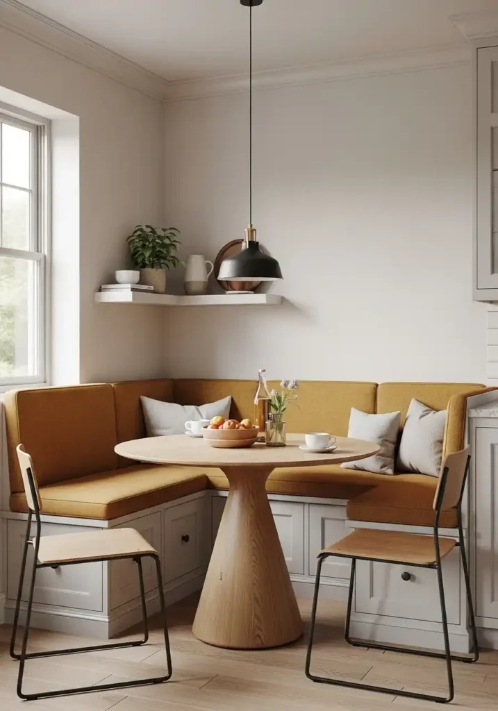 A built-in breakfast nook integrated directly into the small kitchen’s corner is the casual dining addition that creates the most genuine, the most warmly domestic, and the most spatially efficient dining destination available within a compact kitchen footprint — because the fixed bench seat requires zero chair-pullout clearance on its wall sides, making the nook’s floor footprint dramatically smaller than the equivalent number of freestanding chairs around a freestanding table would demand in the same corner. The nook creates a complete dining destination for four within a floor area that a conventional dining set of equivalent seating capacity would find barely adequate.