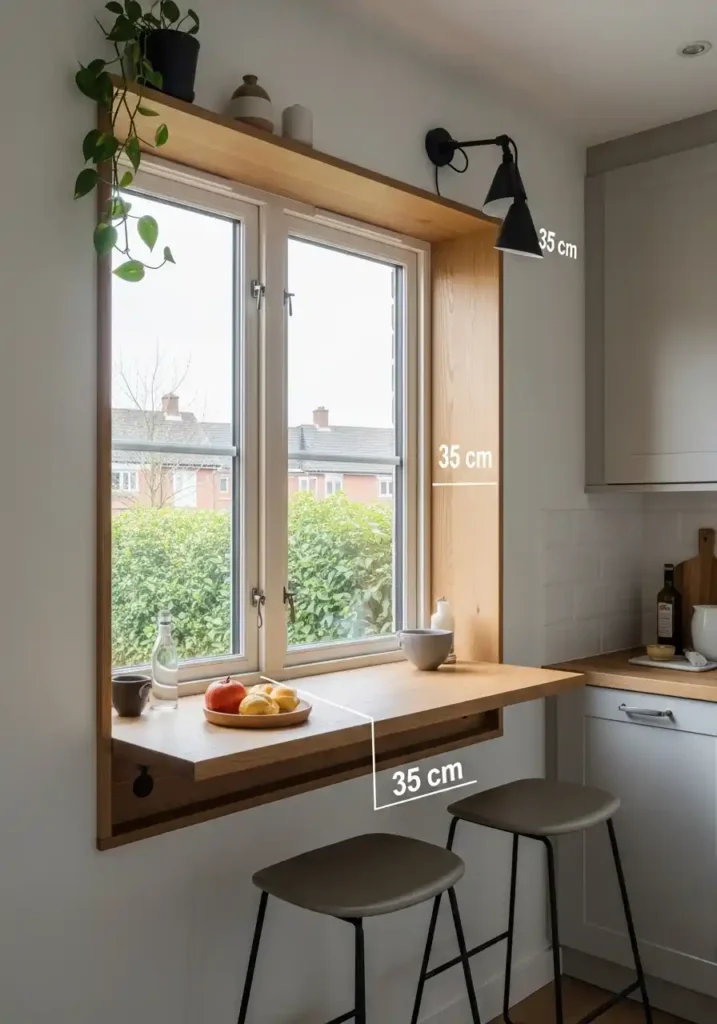A window ledge extended and reinforced to serve as a breakfast bar is the small kitchen’s most brilliantly creative and most spatially efficient casual dining solution — because it converts an existing architectural feature, the window ledge, into a fully functional dining surface of appropriate depth and appropriate height without any additional floor area requirement, any structural modification beyond the ledge reinforcement and extension, or any disruption to the kitchen’s layout or workflow. The window breakfast bar is literally created from nothing — from the existing space of the window recess — making it the small kitchen’s most spatially democratic and most creatively intelligent dining addition.