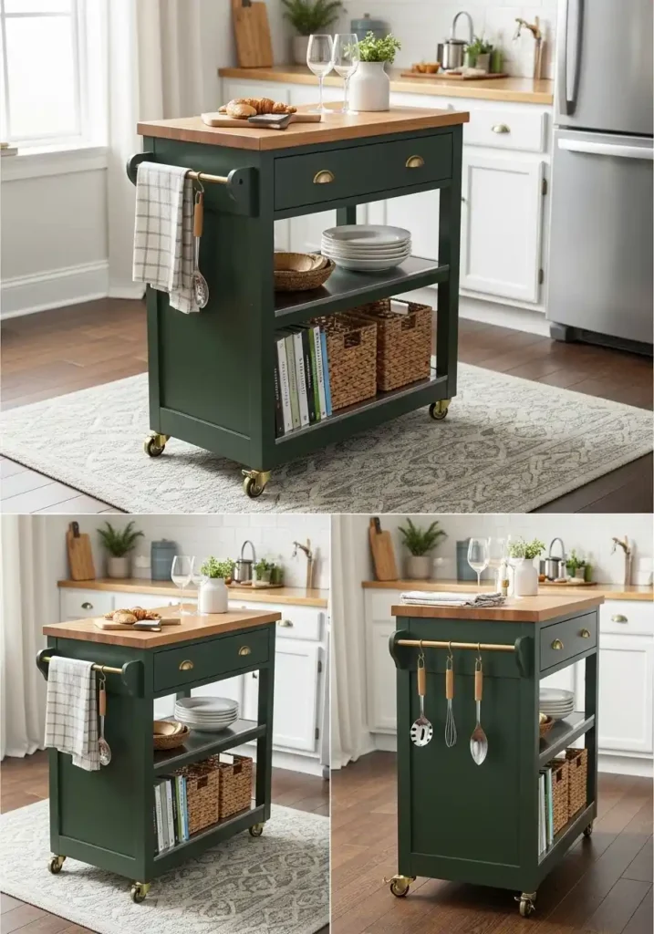 The design of a rolling kitchen island in a small kitchen should be approached with genuine aesthetic ambition — because despite its mobility, the rolling island is always a prominent, always-visible element of the small kitchen and always contributing to or detracting from the kitchen’s overall design quality. A beautifully painted base in a rich, unexpected color — forest green, midnight navy, or warm terracotta — with a warm butcher block or marble top creates an island of genuine visual character and genuine material impact that makes the small kitchen feel more designed and more considered. Hooks on the sides for hanging utensils and open shelves beneath for cookbooks add the practical layers that make the island genuinely hardworking.