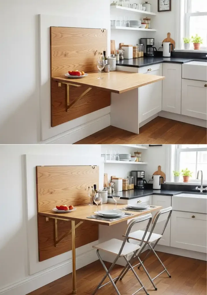 A fold-down dining table mounted on the kitchen wall is the dual-function solution that most brilliantly and most completely solves the small kitchen’s most persistent spatial challenge — the need to accommodate casual dining within a footprint that cannot permanently dedicate floor area to a fixed dining table and dining chairs without compromising the kitchen’s cooking function. The fold-down table provides a full, properly sized, properly supported dining surface when deployed and returns completely to the wall plane when not needed, occupying zero floor space and zero visual space in the kitchen’s daily environment between mealtimes.