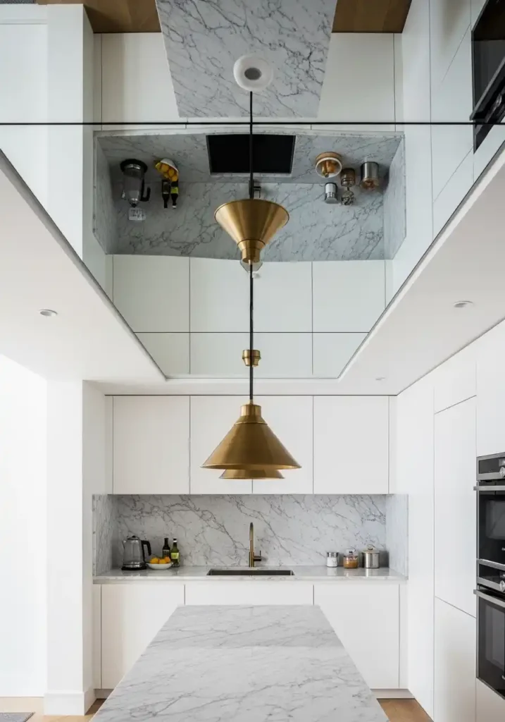 A mirror-finish ceiling panel above the kitchen’s central counter and island area is the spatial transformation that most powerfully and most completely creates the impression of greater ceiling height in a small kitchen — because a ceiling mirror reflects the kitchen’s pendant lights, its countertop, and its full vertical dimension back downward, creating a reflected image that effectively doubles the apparent height of the space in the most visually compelling and the most immediately convincing way available. The small kitchen that feels uncomfortably low-ceilinged becomes a space of surprising, reflected vertical generosity with a ceiling mirror of appropriate scale and quality.