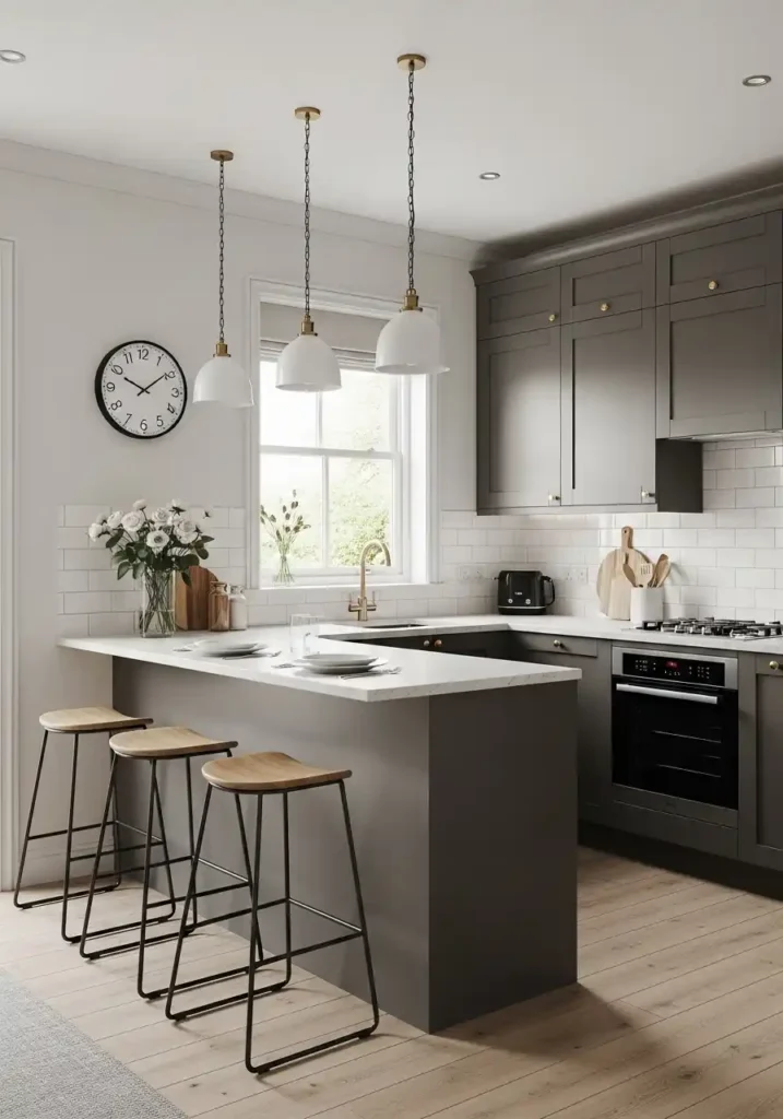 The peninsula’s dual function — providing a kitchen-side preparation surface extension for the cook and a living-room-side casual dining bar for seated guests — creates the small kitchen’s most socially generous and most practically intelligent furniture piece, because it simultaneously solves the most important functional challenge of the compact cooking space and the most important social challenge of the open-plan small home: the desire for the cook to remain part of the social life of the home during cooking rather than being isolated in a separate, enclosed kitchen. Three slim counter stools on the living room side of the peninsula transform every cooking session into a genuinely social, genuinely connected experience.