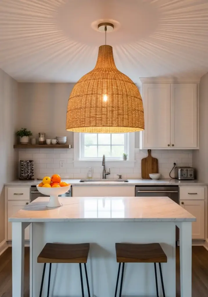 The oversized rattan pendant is the specific light fitting that creates the most beautifully warm and the most completely atmospheric statement in a small kitchen — because rattan’s natural fiber construction creates the most organic, most warm, and most completely inviting pendant form available, casting a specific quality of warm, dappled light through its woven structure that no glass or metal alternative can replicate with the same quality of organic, filtered warmth. The rattan pendant’s scale, which appears generously large against the small kitchen’s dimensions, paradoxically makes the kitchen feel more spatially generous rather than more cramped — the large pendant drawing the eye upward and making the vertical dimension above the counter feel abundant and architecturally significant.