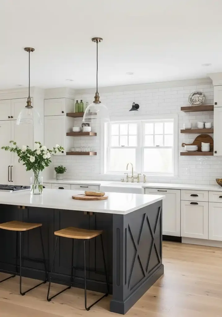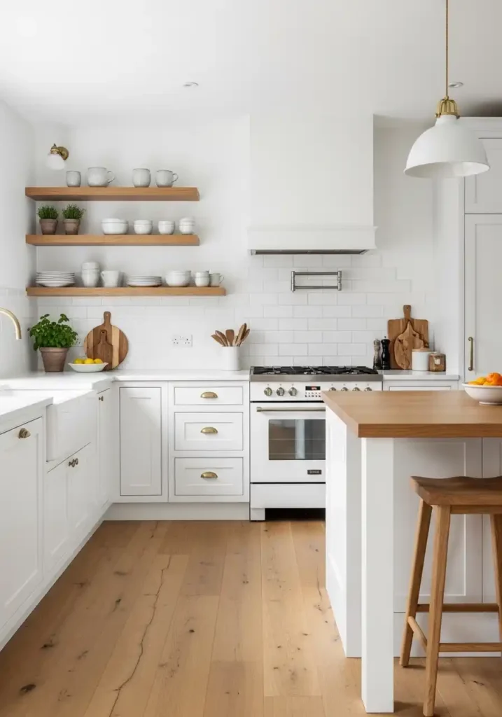 The specific wood elements that create the most beautiful and the most timeless accents in an all-white kitchen are those that are used sparingly enough to maintain the white palette’s essential brightness and spatial generosity while contributing sufficient warmth and material richness to prevent the white from feeling cold or institutional. Open oak shelving rather than full upper oak cabinets. An oak island top rather than an all-oak island. Oak counter stools rather than oak dining chairs. The discipline of restraint in the wood placement is what keeps the white kitchen bright and what makes the wood accents appear as warm, carefully considered highlights rather than as a competing visual element competing with the white for dominance.