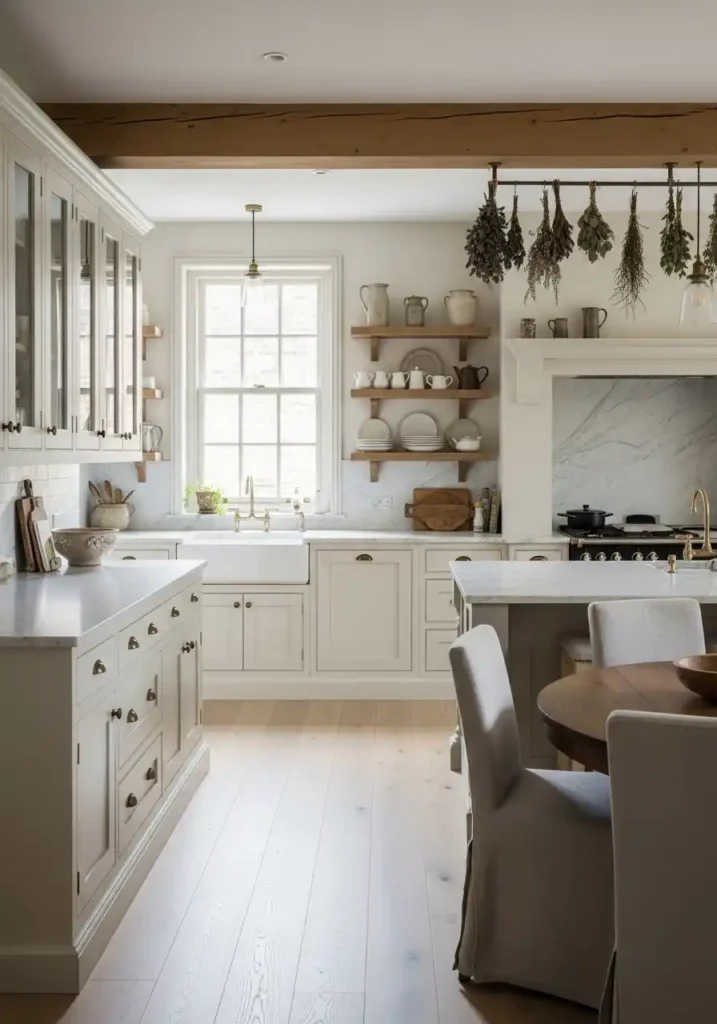 The perfectly timeless kitchen — the one that looks equally, completely, and deeply beautiful on the day it is installed and on the day fifty years later when the marble has developed its gentle use marks, the brass has deepened into its warm patina, the stone floor has acquired its beautiful worn polish, and the shaker cabinets look as precisely, enduringly correct as they did the first morning the sun fell across them — is the accumulated, harmonious, completely resolved result of multiple timeless decisions made with genuine knowledge, genuine humility before the evidence of design history, and genuine commitment to quality over currency. The shaker cabinet. The marble counter. The Belfast sink. The brass hardware. Each enduring element amplifies every other.