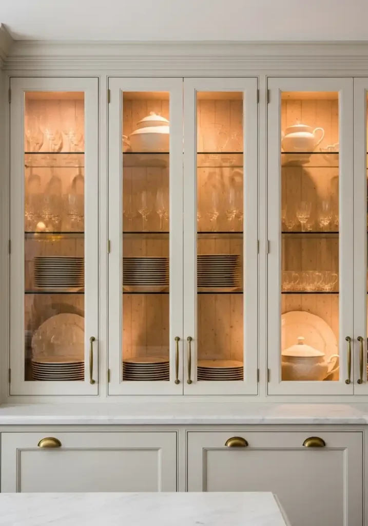 Glass-front kitchen cabinets are the design detail that has been creating kitchens of superior warmth, superior personal expression, and superior visual depth to their solid-front equivalents for as long as kitchen cabinetry has been designed with the ambition of being genuinely beautiful rather than merely functional — because the glass cabinet front invites the eye into the cabinet’s interior, creating a quality of visual depth and material transparency that makes the kitchen wall appear to recede rather than advance, and that transforms the kitchen’s storage into a permanent, softly visible display of the beautiful objects it contains. The glass cabinet front makes the kitchen’s depth visible and makes its contents part of its decoration.