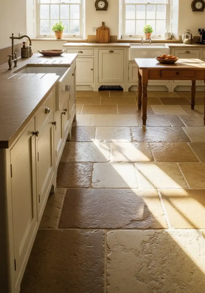 Natural stone floors in a kitchen age with a beauty and a character that no manufactured flooring material can approach or replicate — because stone is a geological material of genuine age and genuine natural formation that was beautiful before it arrived in the kitchen and that continues developing its specific, entirely individual beauty throughout every year of its use, acquiring the specific quality of gentle wear and warm patina that makes aged stone the most beautiful and the most materially authentic floor available in any domestic space. A stone kitchen floor that has been in use for fifty years is incomparably more beautiful than a new stone floor, because fifty years of daily cooking and daily living have given it a depth and a character that only genuine use and genuine time can create.