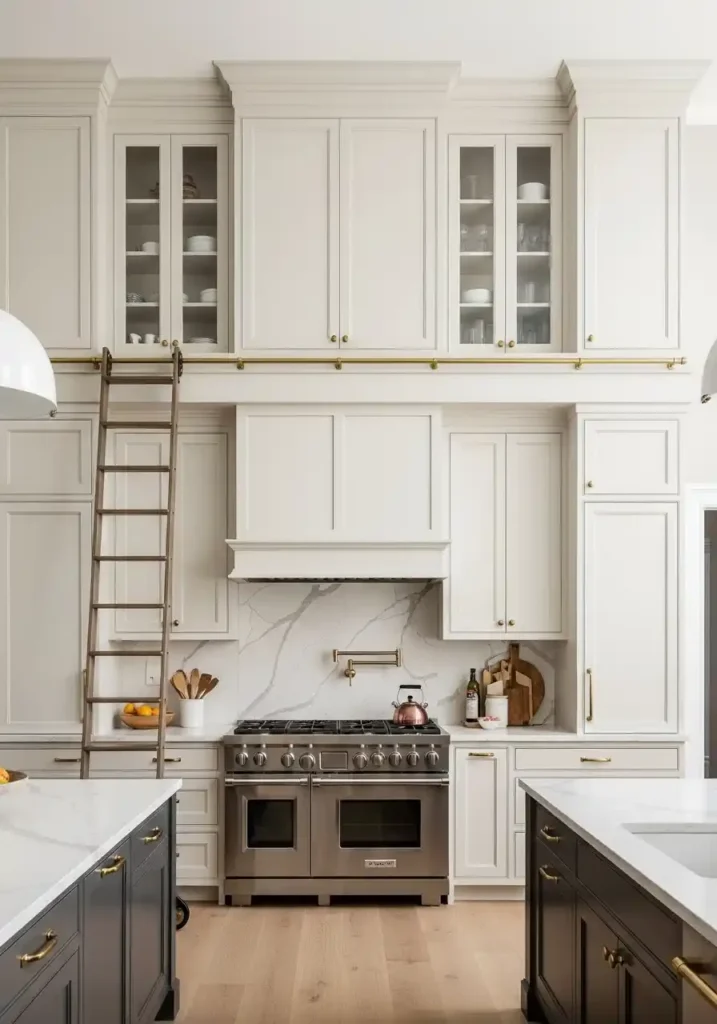 The rolling library ladder on a brass track is the practical and aesthetic device that transforms the floor-to-ceiling kitchen cabinet from a beautiful but partially inaccessible storage system into a completely functional, completely accessible, and genuinely charming kitchen feature of extraordinary character — because the library ladder solves the practical problem of reaching the highest cabinets with elegance and warmth, referencing the most beautiful private libraries and the most distinguished public reading rooms with a domestic warmth and a quality of intellectual romance that makes the kitchen feel like the home of someone genuinely serious about both cooking and beautiful things. The ladder is the detail that makes the full-height kitchen magnificent rather than merely practical.