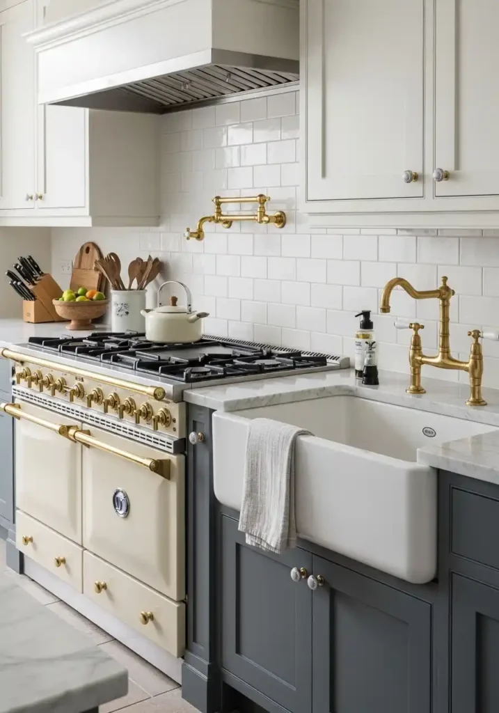 The polished brass hardware that ties the two tones of the navy and cream kitchen together is the material detail with the greatest unifying influence in the entire combined color scheme — because brass in its warm, amber-gold tone creates a metallic accent that is equally beautiful against the deep navy and the warm cream simultaneously, appearing to draw warmth from the navy’s depth and warmth from the cream’s lightness in equal measure, and making both cabinet tones appear more beautiful and more resolved in the brass hardware’s presence than they would in the company of any cooler or less organically warm metallic alternative. The brass is the golden thread that ties the two tones into a single, beautifully unified kitchen composition.