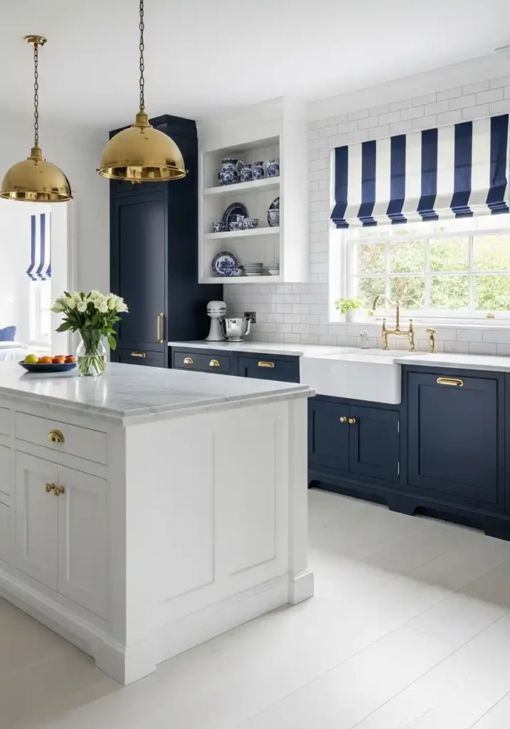 Navy blue and white is the kitchen color combination that has been captivating designers, homeowners, and magazine editors without interruption for longer than any other color pair in residential kitchen design — because it possesses the specific, rare quality of a combination that is simultaneously classic and fresh, familiar and exciting, completely traditional in its references and completely contemporary in its energy. Navy and white is the color of beautiful things that have always existed — the sea and the sky, naval uniforms and white sails, blue and white ceramic tradition from Delft to Wedgwood — and its presence in a kitchen creates an immediate connection to this vast, beautiful tradition of blue and white material culture.