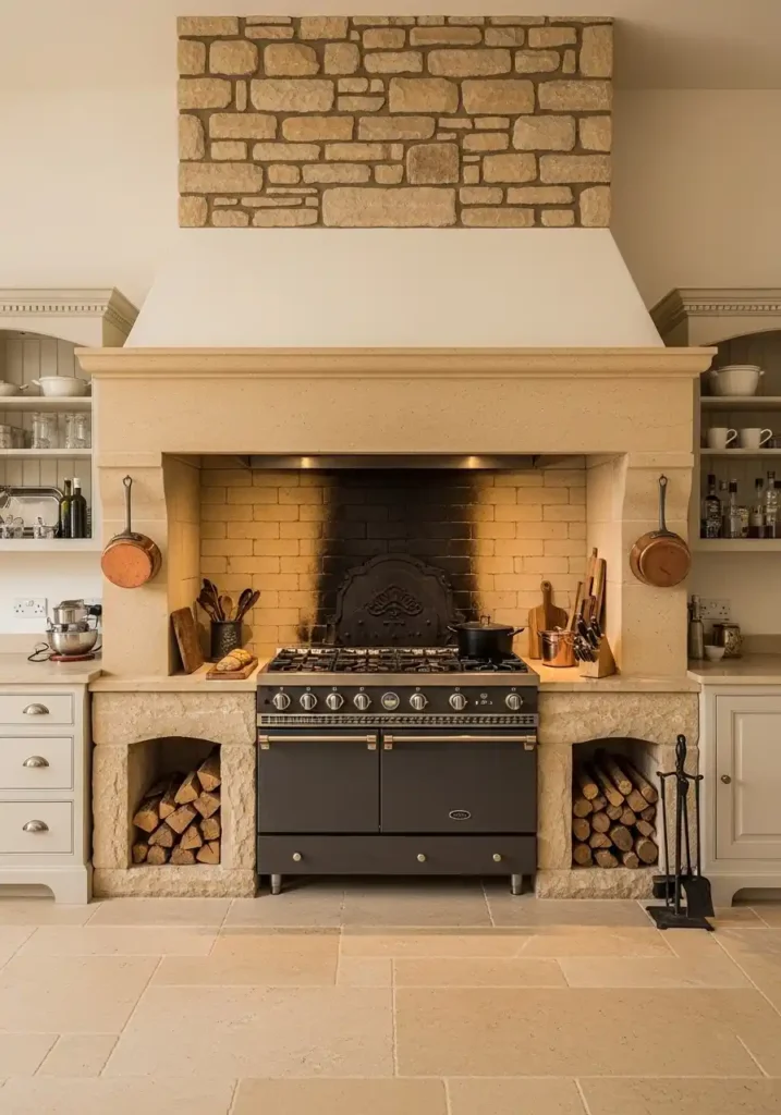The custom plaster range hood within the cooking hearth is the contemporary element that brings the ancient hearth tradition into the modern kitchen with the most architectural confidence and the most complete design resolution — because the plaster hood, forming a smooth, warm, seamless transition between the working range below and the chimney breast above, creates a cooking alcove of such complete, enveloping, warm architectural presence that the cook standing at the range within it is genuinely surrounded by architecture on three sides, creating a specific quality of working within a space rather than in front of a surface that makes cooking feel like a genuinely housed, genuinely purposeful, genuinely magnificent act.