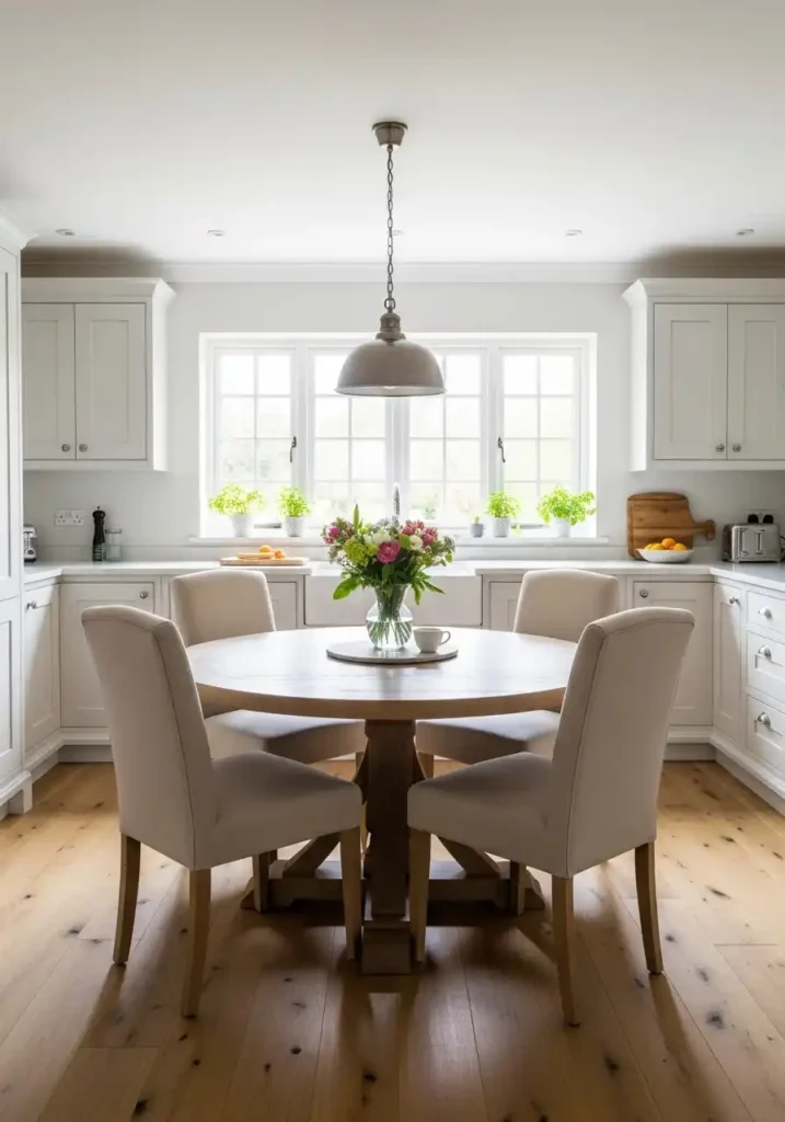 The round dining table at the kitchen center is specifically the most socially perfect form for this position — because the round table creates a gathering of complete democratic equality between every person seated at it, with no head and no foot, no better position and no worse position, every diner equally central and equally part of the conversation at every moment. A round kitchen table creates a social dynamic of such genuine, effortless equality and such complete, natural inclusion that it makes every meal eaten at it feel like a genuinely shared, genuinely communal experience rather than a hierarchy of positions around a rectangular surface. This is the timeless kitchen’s most socially generous design decision.