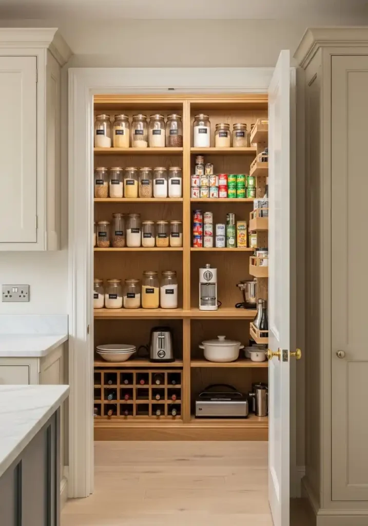 The specific organizational pleasure of a well-designed walk-in pantry is the pleasure of a room where every category of kitchen provision has its own clearly designated place — dry goods on one set of shelves, canned goods on another, small appliances on a third, wine on a fourth — and where the act of provisioning the kitchen is as pleasurable as the act of cooking within it, because the pantry’s organization makes every ingredient immediately visible, immediately accessible, and immediately inspiring to the cook who surveys its beautifully organized abundance each morning and selects the specific ingredients whose combination will constitute that evening’s meal. The pantry makes cooking more organized and more creative simultaneously.