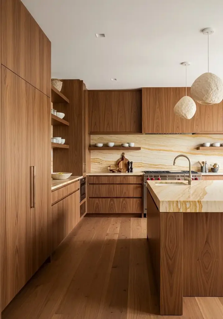 Walnut and marble create the specific wood and stone pairing that is most magnificently beautiful in a contemporary kitchen context — because walnut’s rich, warm brown with its characteristic straight grain and its natural depth of color creates a wood surface of genuine material luxury that makes marble appear more white and more dramatically veined by contrast, while marble’s bright, stone-cold white and its geological veining makes the walnut appear warmer, deeper, and more organically rich by the same contrast. Each material makes the other more beautiful by its proximity, creating a material dialogue of such genuine, mutual enhancement that the kitchen of walnut and marble is always, in every specification and every layout, more beautiful than either material alone could achieve.